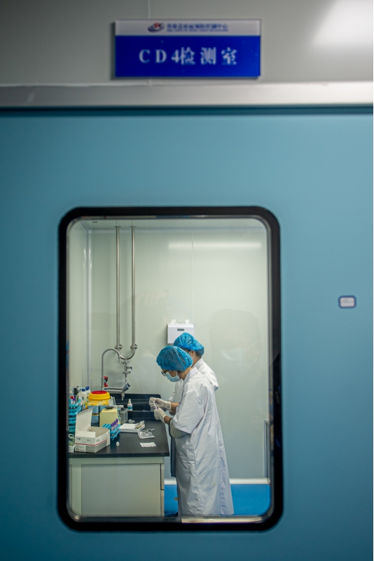 “愛心紅絲帶”項目工作人員在檢測室工作