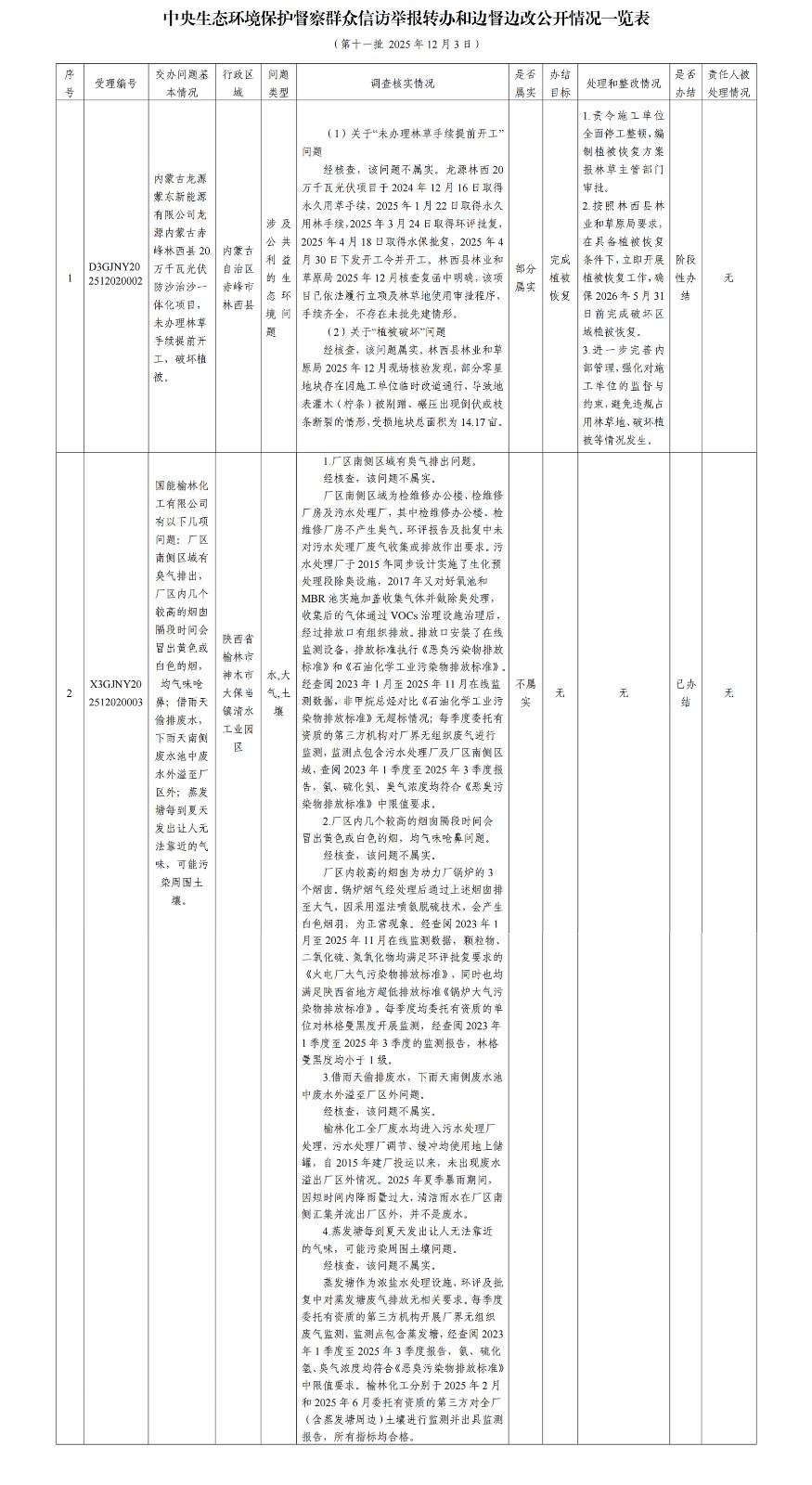 中央生態(tài)環(huán)境保護督察群眾信訪舉報轉(zhuǎn)辦和邊督邊改公開情況一覽表(第十一批 2025年12月3日)