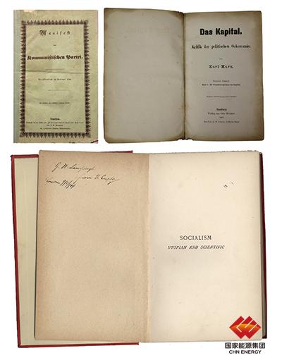 左上圖為1848年《共產(chǎn)黨宣言》德文第一版。右上圖為1867年《資本論》德文第1卷第一版。下圖為恩格斯的題字贈(zèng)書(shū)《社會(huì)主義從空想到科學(xué)的發(fā)展》,1892年英文版。