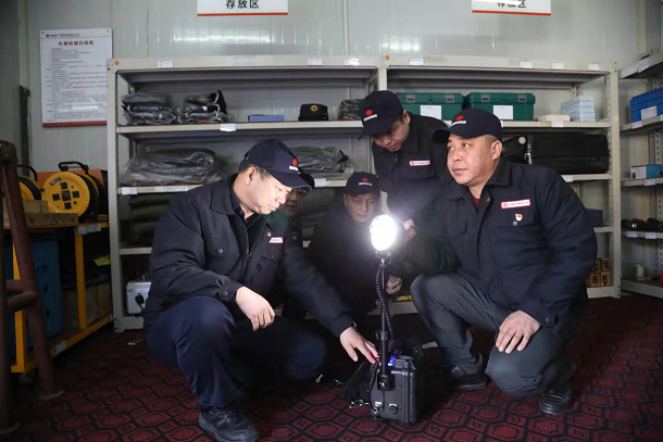 圖為高鳳才正在檢查應(yīng)急救援物資儲備情況