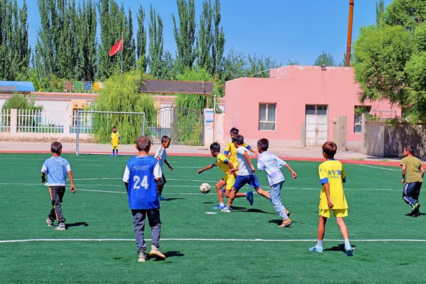 圖為孩子們?cè)谛滦藿ǖ牟賵?chǎng)踢足球