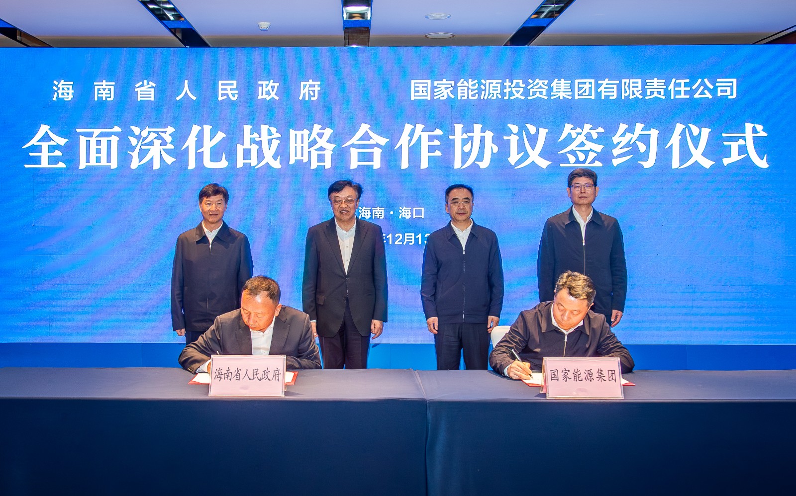 12月13日,國家能源集團與海南省政府在??诤炇鹑嫔罨瘧?zhàn)略合作協(xié)議。國家能源集團黨組書記、董事長鄒磊,總經(jīng)理、黨組副書記馮來法在??诎輹D鲜∥瘯涶T飛,省委副書記、省長劉小明,并共同見證簽約。國家能源集團黨組成員、副總經(jīng)理傅振邦,海南省委常委、常務副省長巴特爾代表雙方簽約。