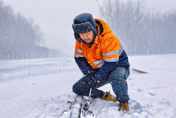 正午時分,風雪愈猛,狂風卷著雪粒橫沖直撞。“全體集合!分組復清復查,確保無積雪殘留、無故障隱患!”張智輝的指令通過對講機傳出,隊員們迅速集結(jié),雖奮戰(zhàn)數(shù)小時面帶疲憊,但望向鐵道線的眼神依舊堅定。他們沿鐵道線排開,鏟雪、吹雪、檢查、調(diào)試,動作流暢形成“風雪作戰(zhàn)”流程。寒風如針鉆進衣領(lǐng)袖口,信號工馬寶軍臉被吹得生疼,卻笑著說:“這點兒冷算啥,咱們多干會兒,火車就能早一點安全通過?!毙氯肼毜钠胶1蚧乖谘┑?,爬起來第一時間檢查工具:“這是咱們的‘武器’,不能壞?!?/p>
