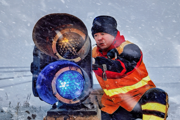 處理完轉(zhuǎn)轍機的故障隱患,他們的戰(zhàn)斗還遠未結(jié)束。沿著鐵道線繼續(xù)前行,每一架信號機都是他們的“體檢對象”。“列車信號燈泡端電壓需10.2至11.4V,調(diào)車信號9.0至11.4V,差0.1V看似不起眼,雪天視線差需要司機多花幾秒確認,滿載煤炭的火車多停一秒,電廠‘煤倉’就少一分保障!”張智輝一邊調(diào)試儀器,一邊向劉雁軍說著,雪花飄進眼中便用力眨眼甩去,目光始終緊盯數(shù)值。信號工李長亮則手持扳手檢查電纜接頭:“風雪天電纜易被積雪壓迫,接頭低溫易松動,咱們多查一分,運輸就多一分保障。”手套磨破、臉頰干裂、鞋子灌滿雪水,他們始終堅守崗位,用較真態(tài)度守護每一處設(shè)備。