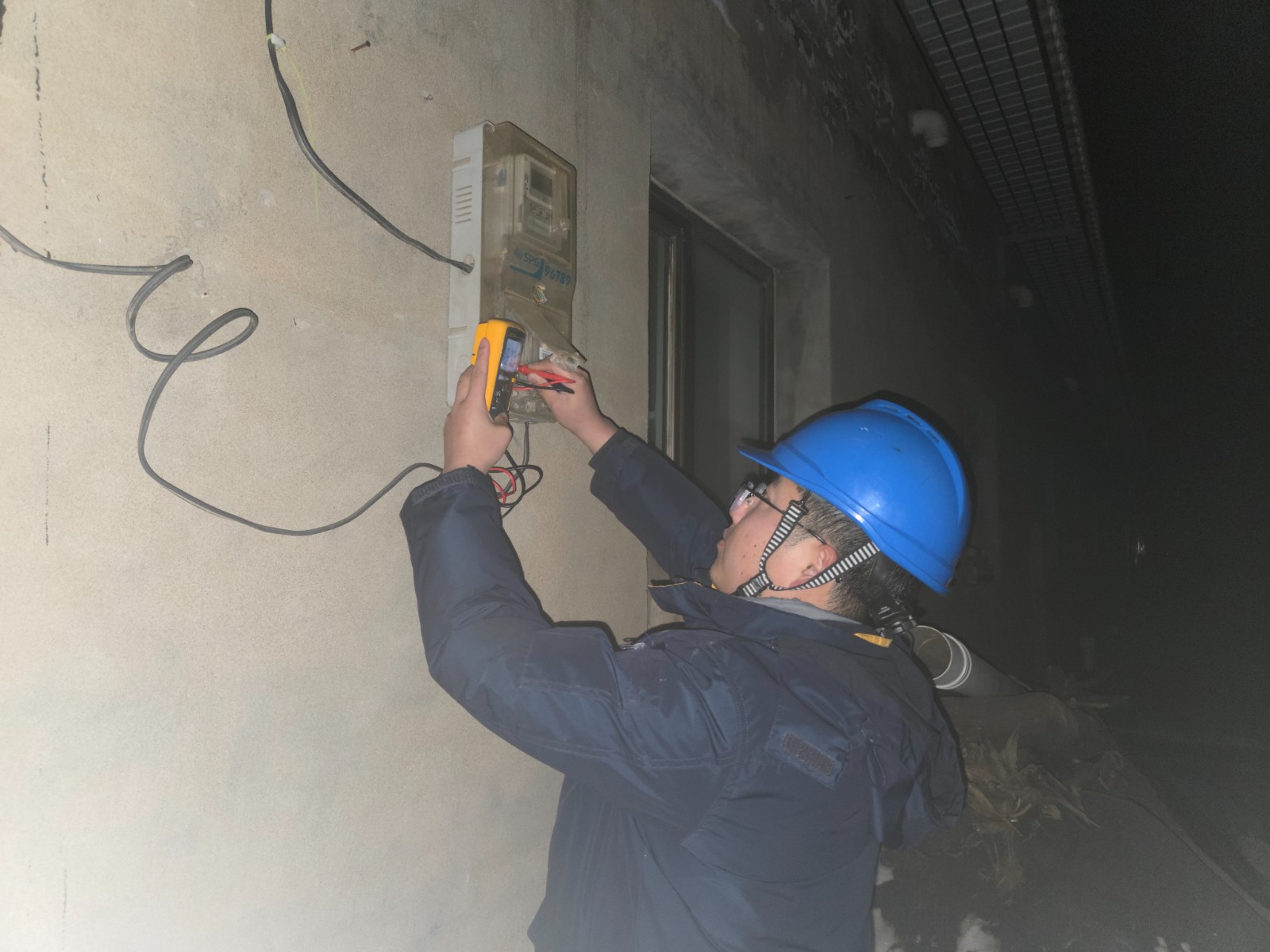 到達現場后,兩人迅速展開檢查。手電光柱劃過電表箱,很快鎖定故障點——電表下端線路老化嚴重,絕緣皮破損導致短路。