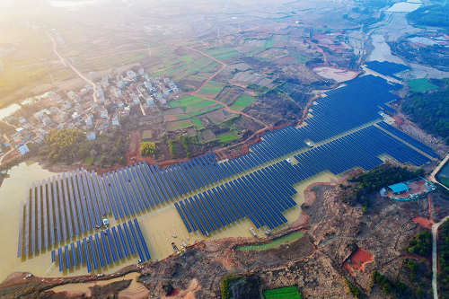 江西黃金埠公司江埠18萬千瓦漁光互補(bǔ)集中光伏發(fā)電項(xiàng)目現(xiàn)場(chǎng)(拍攝作者:楊偉?。?/p>