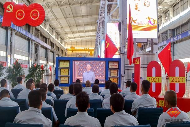 圖為勝利能源設備維修中心員工在卡保間收看慶祝中國共產(chǎn)黨成立100周年大會盛況