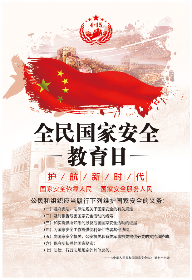 今年4月15日,是黨的十九大后第一個全民國家安全教育日。深入開展國家安全宣傳教育,切實增強全體干部職工國家安全意識,是集團公司貫徹落實新形勢下國家安全工作部署的重要任務,是建設具有全球競爭力的世界一流能源集團的重要保障。為進一步普及國家安全知識,集團網(wǎng)站特制作專題,希望全體干部職工認真學習,進一步增強國家安全意識,依法履行維護國家安全的職責和義務,筑牢國家安全“鋼鐵長城”。