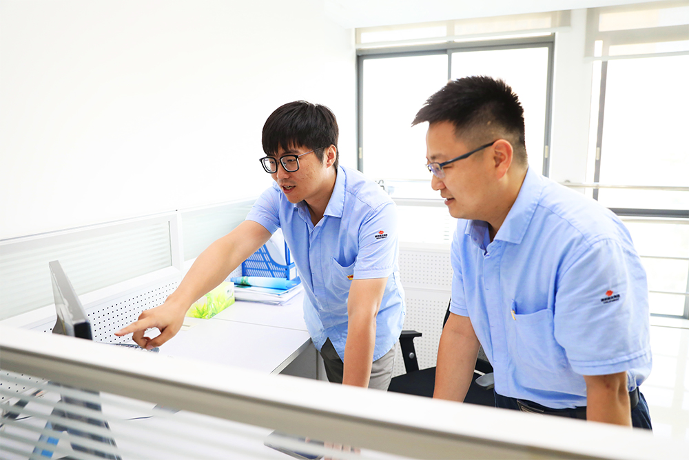 圖為廣西國能能源發(fā)展有限公司規(guī)劃建設(shè)部主管熊浩、廣西國能能源發(fā)展有限公司貴港分公司副經(jīng)理宋晨光在風(fēng)電場智慧監(jiān)控平臺(tái)上查看風(fēng)機(jī)運(yùn)行數(shù)據(jù)。