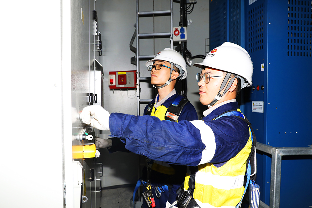 圖為天堂頂風(fēng)電場運(yùn)維人員潘展?jié)h、劉振強(qiáng)正在風(fēng)機(jī)內(nèi)部進(jìn)行設(shè)備維護(hù)。