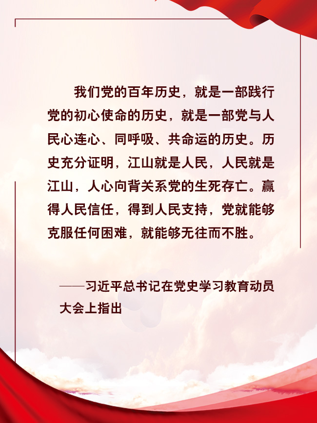 百年征程波瀾壯闊,百年初心歷久彌堅(jiān)。站在“兩個(gè)一百年”的歷史交匯點(diǎn)上,更需要廣大黨員干部學(xué)史明理、學(xué)史增信、學(xué)史崇德、學(xué)史力行,從黨史中汲取不竭的精神動(dòng)力,始終堅(jiān)持人民至上,緊緊依靠人民、不斷造福人民、牢牢植根人民,與人民心心相印、與人民同甘共苦、與人民團(tuán)結(jié)奮斗,與億萬人民一起奔向更美好的未來。(文字:劉躍江 海報(bào):張倩)