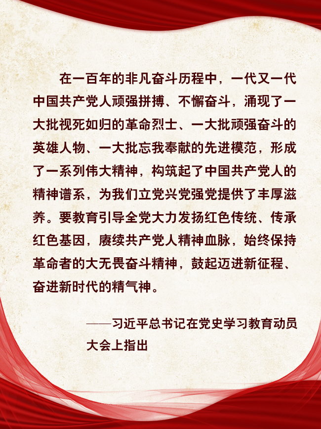 歷史是最好的教科書,也是最好的清醒劑。過去的一百年,是我們黨矢志踐行初心使命的一百年,是篳路藍(lán)縷奠基立業(yè)的一百年,是創(chuàng)造輝煌開辟未來的一百年。一百年的非凡奮斗歷程中,一代又一代中國共產(chǎn)黨人頑強(qiáng)拼搏、不懈奮斗,涌現(xiàn)了一大批視死如歸的革命烈士、一大批頑強(qiáng)奮斗的英雄人物、一大批忘我奉獻(xiàn)的先進(jìn)模范,形成了一系列偉大精神,共同構(gòu)筑起了中國共產(chǎn)黨人的精神譜系,為我們立黨興黨強(qiáng)黨提供了豐厚滋養(yǎng)。只有深入學(xué)習(xí)、準(zhǔn)確理解黨的歷史,才能弄清楚黨從哪里來、要往哪里去,不斷增強(qiáng)對黨的政治認(rèn)同、情感認(rèn)同;才能感受信仰之光、奮斗之艱,以堅定的理想信念鑄魂補(bǔ)鈣;才能常懷憂黨之心、為黨之責(zé)、強(qiáng)黨之志,厚植報國情、立下強(qiáng)國志,以更加昂揚(yáng)的姿態(tài)創(chuàng)造更加輝煌的明天。